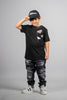 Realizzato in denim nero con lavaggio effetto vintage, presenta dettagli effetto vernice e leggere abrasioni che donano un look vissuto e urbano.
